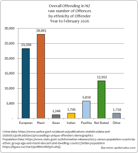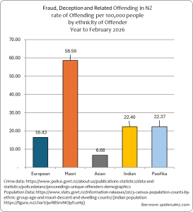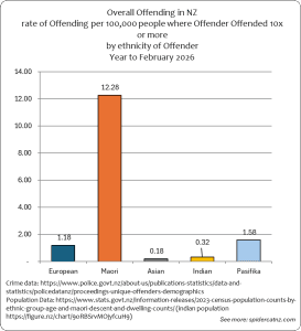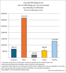 NZ Police Stats provide Demographic breakdown of offenders over time. Using the Census 2023 data, we can calculate the “per-capita” rate of Offending for each group, by dividing the total reported crimes by the number of people in each group. We then multiply that by 100,000 – showing the rate of offending per 100,000 people. This helps give a better picture than simple raw totals when group sizes differ.