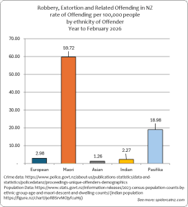 These graphs show all Robbery/Extortion Crimes where an offender was identified and proceedings were brought from March 2025 to February 2026, by ethnic group of the Offender: