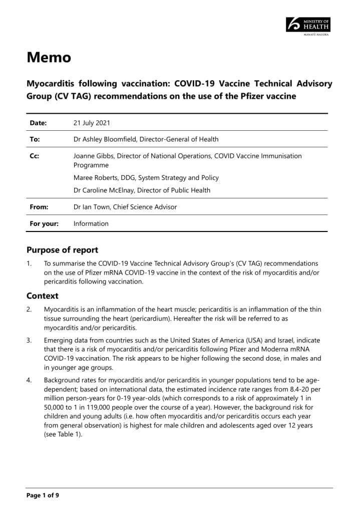 On 21 July 2021, a memo titled “Myocarditis following vaccination: COVID-19 Vaccine Technical Advisory