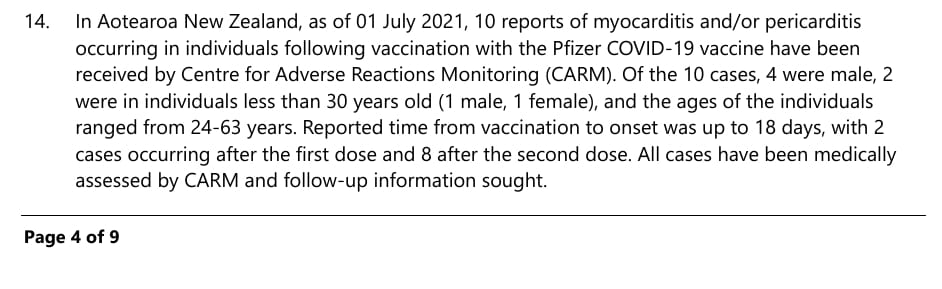 At that stage there had been 10 reports of Myocarditis in NZ following vaccination with Comirnaty. 8 were after the second dose.