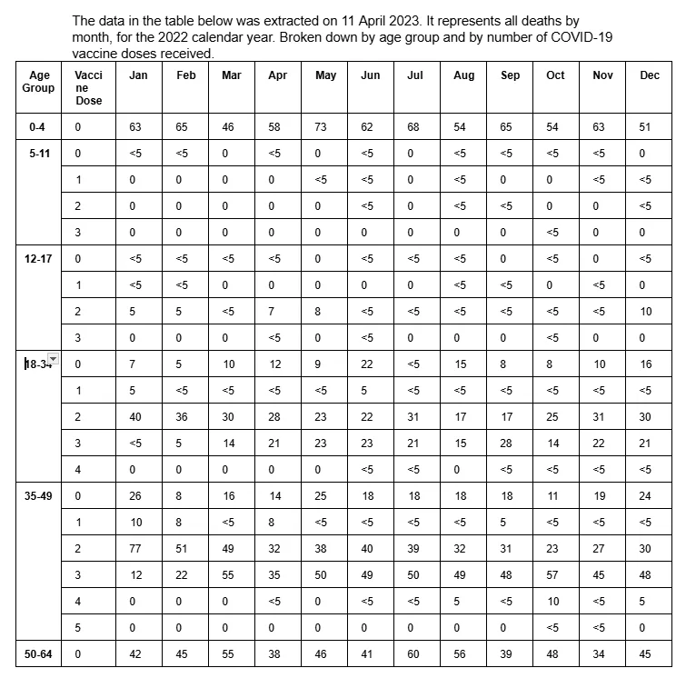 All deaths by month, for 2022 by age group and by number of COVID-19 vaccine doses received – 0-4 age group = 722 deaths!